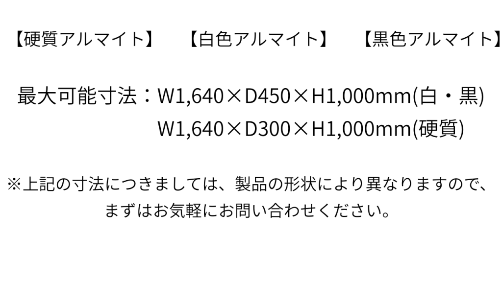 - アルミ材料以外の金属を部品に溶接、接合などすると処理ができません。